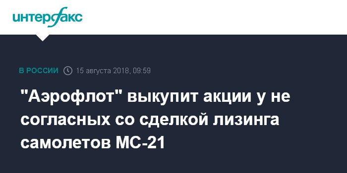 Москва. 15 августа. INTERFAX.RU - ПАО "Аэрофлот" выкупит 47 млн 817 тысяч 796 акций на общую сумму 7 млрд 039 млн 735 тысяч 927,12 рублей у акционеров, которые на годовом собрании акционеров авиакомпании 25 июня 2018 года проголосовали против крупной сделки лизинга 50 пассажирских самолетов МС-21-300 или не приняли участия в голосовании, говорится в сообщении компании.