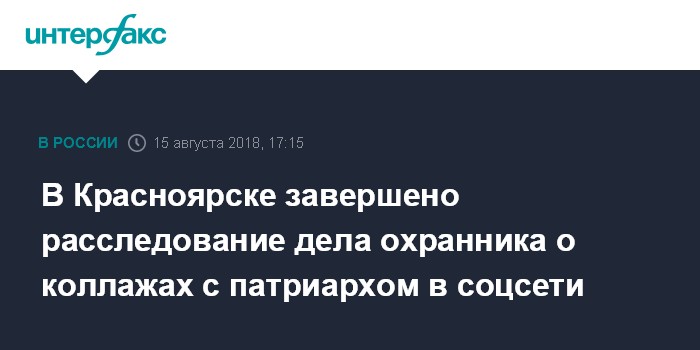 Москва. 15 августа. INTERFAX.RU - В Красноярске завершено расследование уголовного дела против местного жителя, обвиняемого в возбуждении ненависти и вражды из-за коллажей с президентом и патриархом, размещенных в соцсети "ВКонтакте", сообщил "Интерфаксу" адвокат международной правозащитной группы "Агора" Владимир Васин.