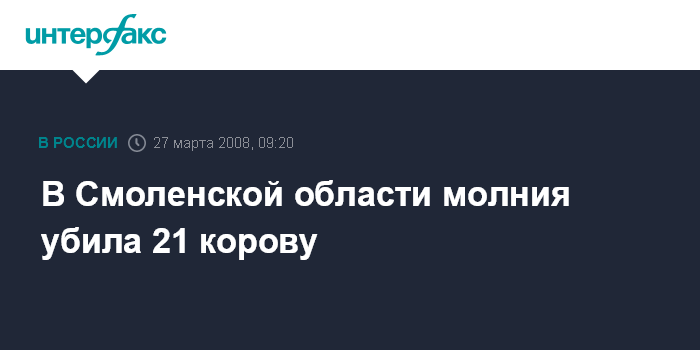 Смоленск. 27 марта. INTERFAX.RU - В Смоленской области разрядом молнии убило 21 корову, сообщили "Интерфаксу" в четверг в отделении информации и общественных связей УВД по региону.