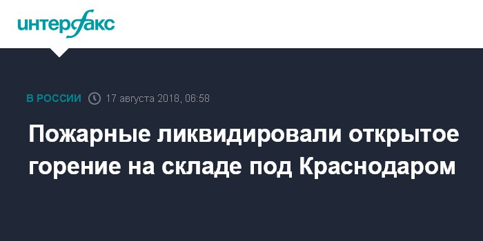 Москва. 17 августа. INTERFAX.RU - Ликвидация открытого горения объявлена на месте тушения пожара на складе в городе Тимашевске в Краснодарском крае, сообщили "Интерфаксу" в ситуационном центре Единой дежурно-диспетчерской службы Тимашевского района.