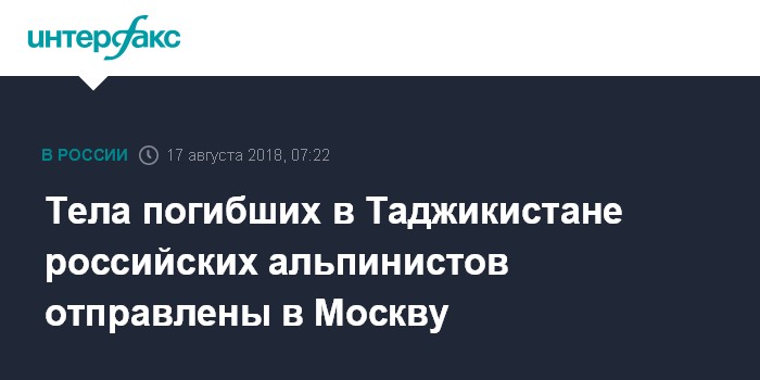 Москва. 17 августа. INTERFAX.RU - Тела трех российских альпинистов, погибших в горах Таджикистана при жесткой посадке вертолета, отправили на родину в пятницу рейсом национальной авиакомпаний "Сомон Эйр", сообщили "Интерфаксу" в Совете по развитию туризма Таджикистана.