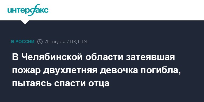 Москва. 20 августа. INTERFAX.RU - Двухлетняя девочка и ее отец погибли на пожаре в частном доме поселка в Челябинской области, сообщает пресс-центр ГУ МЧС России по региону в понедельник.