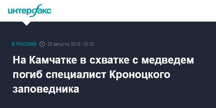 Москва. 20 августа. INTERFAX.RU - Медведь убил привлеченного сотрудника Кроноцкого заповедника на Курильском озере в Южно-Камчатском заказнике. Об этом сообщила агентству "Интерфакс" пресс-секретарь заповедника Мария Воронцова.