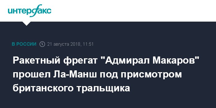 Москва. 21 августа. ИНТЕРФАКС - Британский минный тральщик Hurworth проследил за прохождением через пролив Ла-Манш новейшего фрегата ВМФ России "Адмирал Макаров", оснащенного крылатыми ракетами "Калибр", пишет во вторник The Daily Star, ссылаясь на официального представителя Королевского военно-морского флота Великобритании.