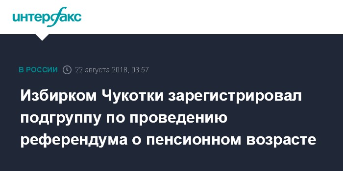 Москва. 22 августа. INTERFAX.RU - Избирательная комиссия Чукотского автономного округа (ЧАО) зарегистрировала региональную подгруппу инициативной группы по проведению референдума о повышении пенсионного возраста.