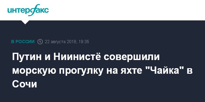 Москва. 22 августа. INTERFAX.RU - Президент РФ Владимир Путин и президент Финляндии Саули Ниинисте продолжили переговоры в неформальной обстановке. В среду вечером российский лидер пригласил своего гостя совершить морскую прогулку на президентской яхте "Чайка".