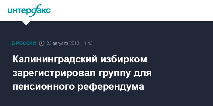"Некоторое время назад калининградские общественники подали в облизбирком ходатайство о регистрации подгруппы региональной группы по проведению референдума с вопросом о пенсионной реформе. Эти документы были приняты и рассмотрены. Группа зарегистрирована", - отметил собеседник агентства.