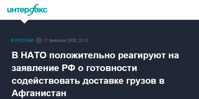 Брюссель. 11 февраля. INTERFAX.RU - Заявления России о готовности расширять содействие НАТО для доставки невоенных грузов в Афганистан вызывают положительную реакцию в НАТО.