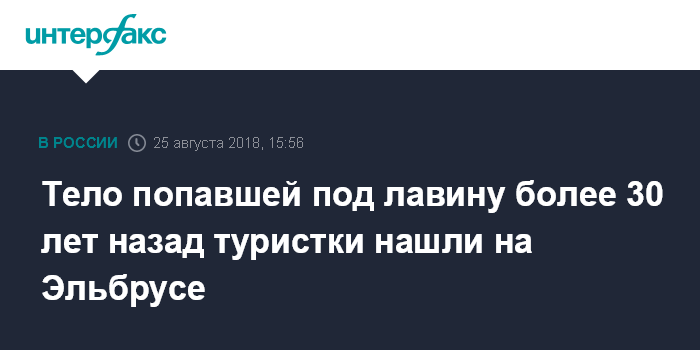 Москва. 25 августа. INTERFAX.RU - Спасатели Карачаево-Черкесии эвакуировали с Эльбруса тело женщины, попавшей под снежную лавину более 30 лет назад, сообщила "Интерфаксу" пресс-секретарь республиканского управления МЧС Бэла Черкесова.