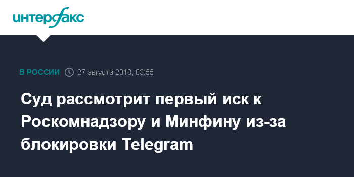 Москва. 27 августа. INTERFAX.RU - Арбитражный суд Москвы в понедельник рассмотрит первый иск к Роскомнадзору и Минфину РФ о взыскании убытков, понесенных из-за последствий блокировки мессенджера Telegram на территории России. Рассмотрение дела назначено на 16:10. Истец - ООО "Инвестори" (Санкт-Петербург) - требует взыскать в свою пользу 5 млн рублей, утверждая, что блокировка Telegram нарушила нормальную работу сайта организации.