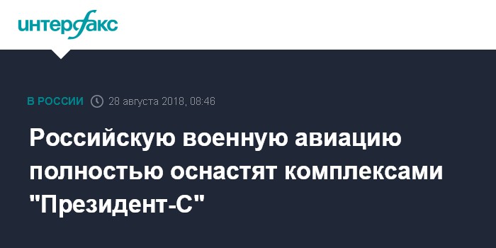 Москва. 28 августа. INTERFAX.RU - Авиацию вооруженных сил РФ в ближайшее время полностью оснастят бортовыми комплексами обороны "Президент-С", сообщил "Интерфаксу" советник первого заместителя гендиректора концерна "Радиоэлектронные технологии" (КРЭТ) Владимир Михеев.