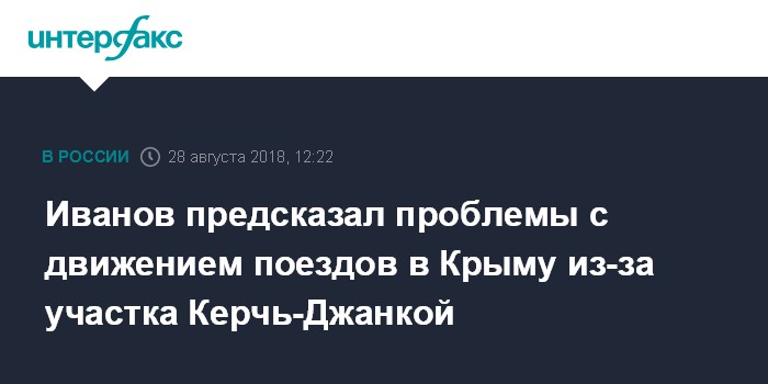 Москва. 28 августа. INTERFAX.RU - После запуска поездов по мосту через Керченский пролив могут возникнуть задержки в движении этих поездов в Крыму из-за неэлектрифицированного участка железной дороги от Керчи на востоке полуострова до Джанкоя на севере, считает спецпредставитель президента России по вопросам природоохранной деятельности, экологии и транспорта Сергей Иванов.