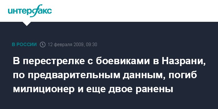 Москва. 12 февраля. INTERFAX.RU - По предварительным данным, один сотрудник милиции погиб и еще двое получили ранения различной степени тяжести в ходе столкновения с бандгруппой в Назрани, сообщили агентству "Интерфакс-Юг" в штабе временной группировки войск.