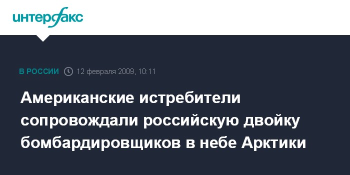 "Маршрут полета проходил через нейтральные воды Северного Ледовитого океана в районе Алеутских островов. Экипажи Дальней авиации успешно выполнили задачу по воздушному патрулированию, проведя в воздухе более 12 часов. На маршруте полета экипажи Дальней авиации сопровождались самолетами НАТО - истребителями F-15", - сообщил "Интерфаксу-АВН" в четверг помощник командующего ВВС РФ подполковник Владимир Дрик.