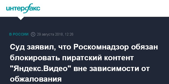 Москва. 29 августа. INTERFAX.RU - Роскомнадзор обязан ограничить доступ к пиратскому контенту на сервисе "Яндекс.Видео" вне зависимости от обжалования компанией решения суда, сообщили "Интерфаксу" в пресс-службе Мосгорсуда в среду.