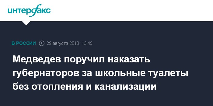 Москва. 29 августа. INTERFAX.RU - Премьер-министр РФ Дмитрий Медведев поручил разработать наказание для губернаторов и чиновников, которые не обеспечили в своих регионах строительство и оборудование школьных санузлов с отоплением и канализацией.
