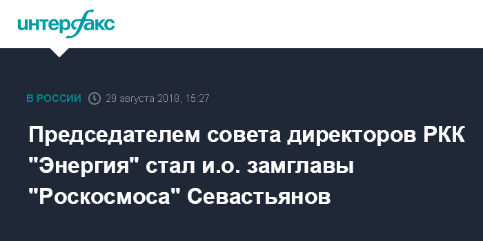 Москва. 29 августа. INTERFAX.RU - Исполняющий обязанности первого замглавы "Роскосмоса" Николай Севастьянов возглавил совет директоров ракетно-космической корпорации (РКК) "Энергия", сообщает в среду пресс-служба корпорации.