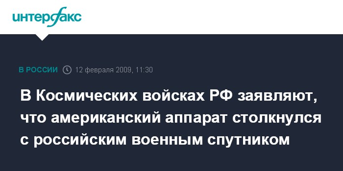 Москва. 12 февраля. INTERFAX.RU - Американский космический аппарат "Иридиум" столкнулся с российским военным спутником, заявил "Интерфаксу-АВН" начальник штаба космических войск генерал-майор Александр Якушин.
