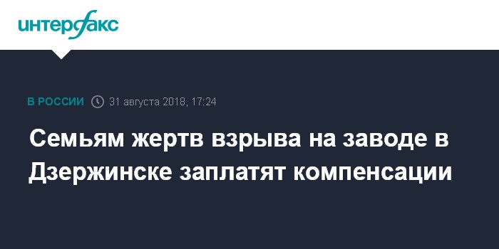 Москва. 31 августа. INTERFAX.RU - Администрация Дзержинска (Нижегородская область) выплатит компенсации семьям погибших и пострадавшим в результате взрыва на заводе Свердлова.