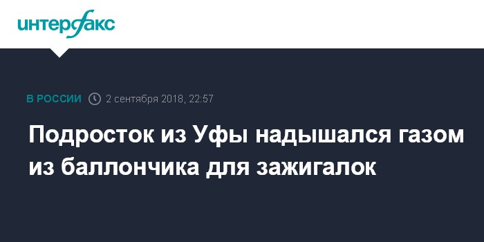 Москва. 2 сентября. INTERFAX.RU - В Уфе погиб подросток, надышавшись газа из баллончика для заправки зажигалок, проводится проверка, сообщается на официальном сайте Следственного управления СК РФ по Башкирии.