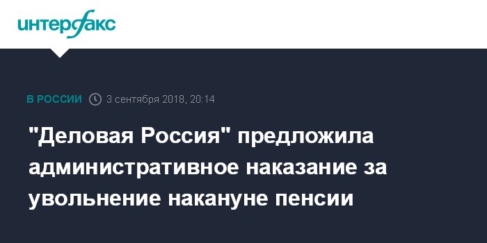Москва. 3 сентября. INTERFAX.RU - Общероссийская общественная организация "Деловая Россия" предлагает вместо уголовной ответственности работодателей за увольнение сотрудников предпенсионного возраста предусматривать административные меры,.
