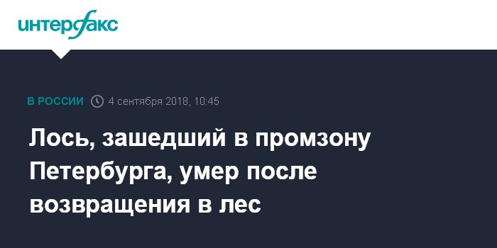 Москва. 4 сентября. INTERFAX.RU - Лось, которого в понедельник обнаружили в Петербурге в промзоне рядом с метро "Обухово", умер после возвращения в лес, сообщает во вторник комитет по природопользованию Санкт-Петербурга.