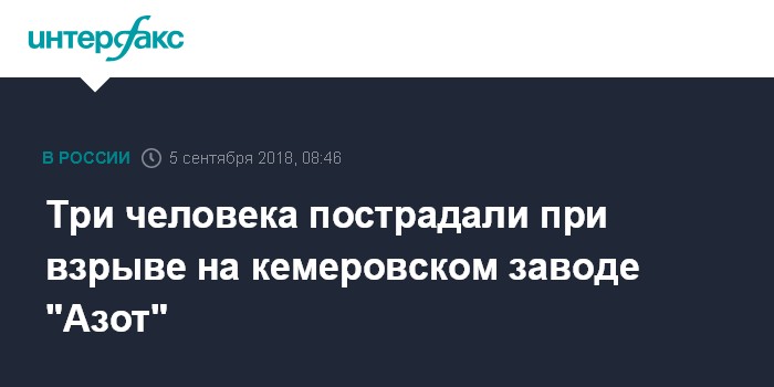 Москва. 5 сентября. INTERFAX.RU - Три человека пострадали при хлопке на кемеровском заводе "Азот", сообщил "Интерфаксу" источник в Службе скорой помощи.
