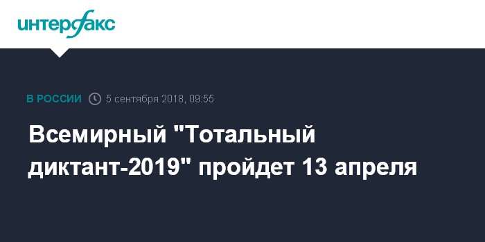 Москва. 5 сентября. INTERFAX.RU - Всемирная акция по проверке грамотности "Тотальный диктант" состоится 13 апреля 2019 года, сообщают организаторы диктанта.