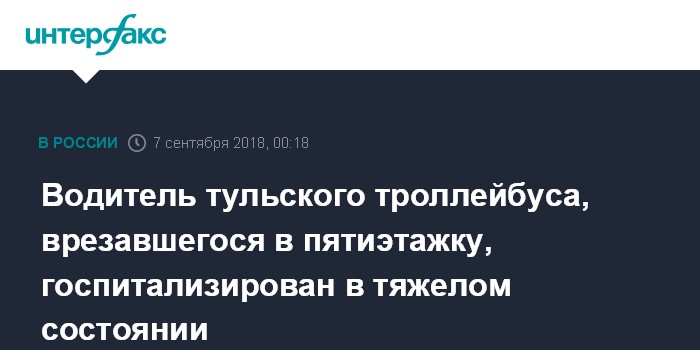 Москва. 7 сентября. INTERFAX.RU - Водитель троллейбуса, который вечером в четверг на полном ходу въехал в стену пятиэтажного дома в Туле, доставлен в больницу в тяжелом состоянии и помещен в реанимацию, сообщили "Интерфаксу" в Ваныкинской городской больнице скорой помощи.