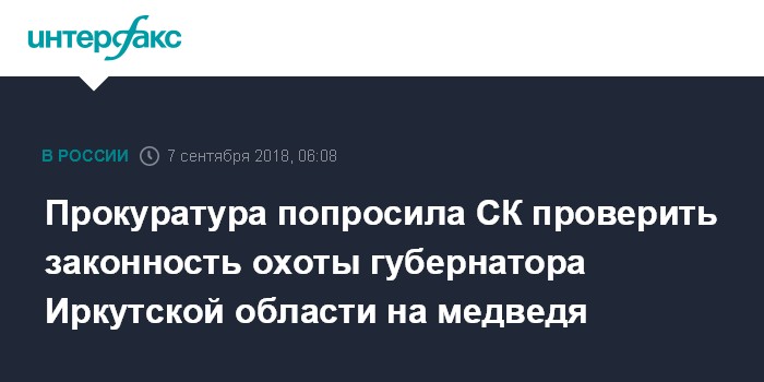 Москва. 7 сентября. INTERFAX.RU - Прокуратура Иркутской области направила в СКР материалы по факту охоты на медведя группы лиц, в том числе губернатора региона Сергея Левченко, сообщается на сайте ведомства.