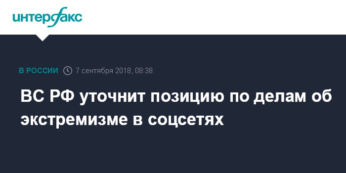 Москва. 7 сентября. INTERFAX.RU - Верховный суд готовит поправки в свое постановление о судебной практике по делам о преступлениях экстремистской направленности в социальных сетях, пишет газета "Ведомости".