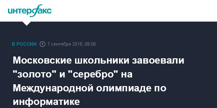Москва. 7 сентября. INTERFAX.RU - Московские школьники завоевали две золотые медали на 30-й Международной олимпиаде по информатике, которая проходит с 1 по 8 сентября в японском городе Цукуба, сообщили "Интерфаксу" в пресс-службе департамента образования столицы в пятницу.