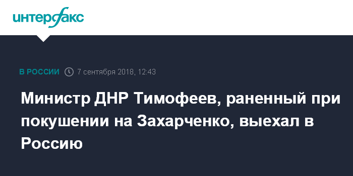 Москва. 7 сентября. INTERFAX.RU - Вице-премьер, министр доходов и сборов самопровозглашенной Донецкой народной республики Александр Тимофеев, получивший ранение во время покушения на главу республики Александра Захарченко, покинул Донецк, сообщил "Интерфаксу" источник в окружении погибшего главы республики.