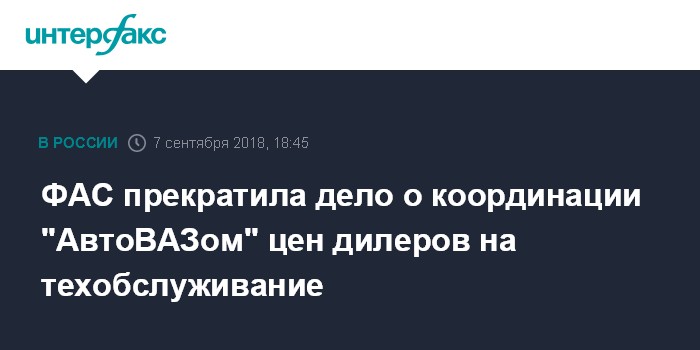 Москва. 7 сентября. INTERFAX.RU - Федеральная антимонопольная служба (ФАС) России прекратила дело, возбужденное в отношении ПАО "АвтоВАЗ". Дело касалось нарушения антимонопольного законодательства в связи с выявленными признаками координации деятельности официальных дилеров компании по проведению техобслуживания (ТО) автомобилей.