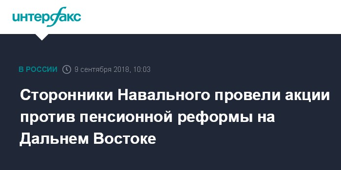 Москва. 9 сентября. INTERFAX.RU - Акции против повышения пенсионного возраста, организованные сторонниками Алексея Навального, прошли в воскресенье во Владивостоке, Хабаровске, Южно-Сахалинске, передают корреспонденты агентства "Интерфакс".
