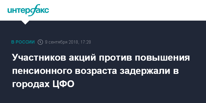 Москва. 9 сентября. INTERFAX.RU - Участники несогласованных с местными властями акций против повышения пенсионного возраста, которые проходят 9 сентября в городах Центрального федерального округа, сообщают о задержанных.
