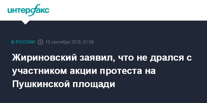 Москва. 10 сентября. INTERFAX.RU - Лидер ЛДПР Владимир Жириновский заявил, что ни с кем не дрался во время акции протеста на Пушкинской площади в Москве; об этом политик сообщил во время пресс-конференции в воскресенье вечером, отвечая на вопросы журналистов.