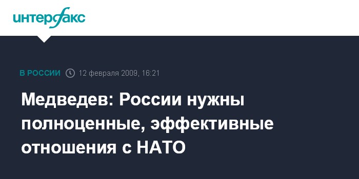 "Мы с вами должны исходить из посыла о том, что Российская Федерация заинтересована в наличии полноценных, полноправных взаимовыгодных отношений с Североатлантическим альянсом, в отношениях, которые не направлены против третьих стран, которые носят именно взаимовыгодный характер, отношениях эффективных, а не бумажных", - сказал Медведев. "И мы к этому готовы", - подчеркнул глава Российского государства.