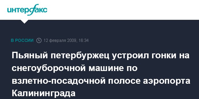 Москва. 12 февраля. INTERFAX.RU - В калининградском аэропорту "Храброво" пьяный житель Санкт-Петербурга угнал снегоуборочную машину, устроив на ней гонки по взлетно-посадочной полосе, сообщила "Интерфаксу" в четверг пресс-секретарь калининградской транспортной прокуратуры Виктория Авдеева.