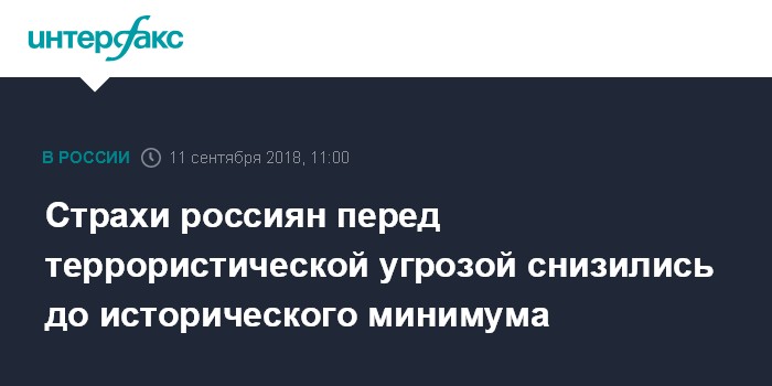 При этом социологи отмечают, что опасения россиян, связанные с террористической угрозой, снизились до исторического минимума. В текущем году индекс опасений снизился до 34 процентных пунктов (п.п). За все время проведения исследований значения этого показателя колебались в диапазоне 37-55 п.п.
