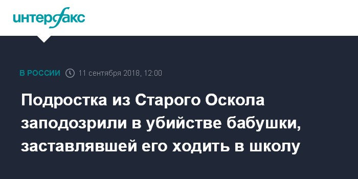 Москва. 11 сентября. INTERFAX.RU - Следственные органы возбудили уголовное дело в отношении 14-летнего жителя Старого Оскола, подозреваемого в убийстве своей бабушки, сообщает пресс-служба СУ СКР по Белгородской области.