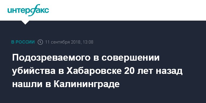 Москва. 11 сентября. INTERFAX.RU - Калининградская полиция нашла мужчину, которого подозревают в убийстве, совершенном 20 лет назад в Хабаровске, сообщили "Интерфаксу" в пресс-службе регионального УМВД.