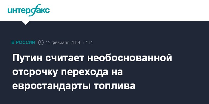 Москва. 12 февраля. INTERFAX.RU - Премьер-министр РФ Владимир Путин считает неуместной и необоснованной отсрочку перехода на евростандарты производства автомобильного топлива. Такое мнение В.Путин высказал в четверг в ходе правительственного совещания по вопросам ТЭК.