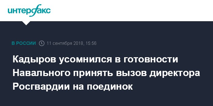 Москва. 11 сентября. INTERFAX.RU - Глава Чечни Рамзан Кадыров считает, что оппозиционер Алексей Навальный не примет вызов на поединок от директора Росгвардии Виктора Золотова.