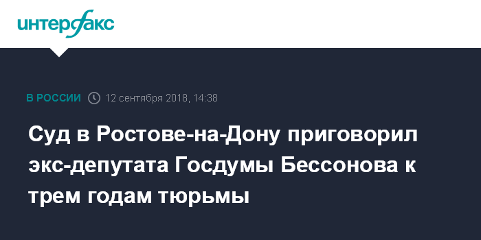 Суд в Ростове-на-Дону приговорил экс-депутата Госдумы Бессонова к трем годам тюрьмы