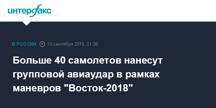 Москва. 13 сентября. INTERFAX.RU - В рамках маневров "Восток-2018" на полигоне "Цугол" для нанесения группового авиационного удара будет привлечено свыше сорока ударных самолетов бомбардировочной, истребительной, штурмовой и армейской авиации, сообщило Минобороны РФ.