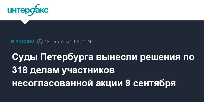 Москва. 13 сентября. INTERFAX.RU - Суды Санкт-Петербурга рассмотрели 318 административных дел в отношении участников несогласованной акции, прошедшей 9 сентября на площади Ленина, сообщила объединенная пресс-служба судов города в четверг.