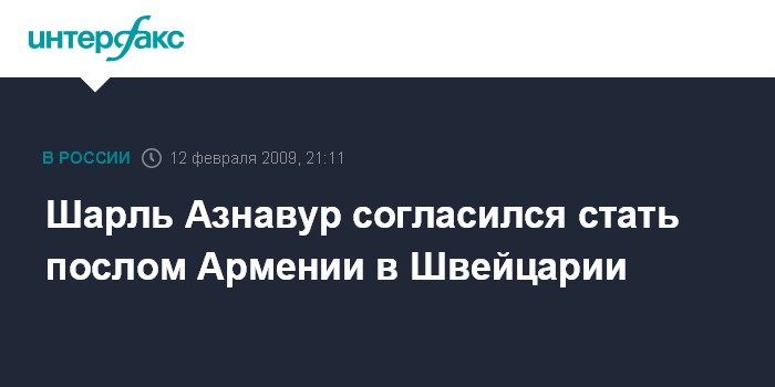 Ереван. 12 февраля. INTERFAX.RU - Известный французский шансонье армянского происхождения Шарль Азнавур станет послом Армении в Швейцарии. В эфире Общественного телевидения Армении Азнавур заявил в четверг, что с радостью принял это предложение.