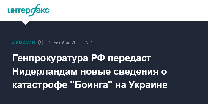Москва. 17 сентября. INTERFAX.RU - Новые данные о катастрофе малайзийского "Боинга" на востоке Украины направлены в Генеральную прокуратуру РФ для дальнейшей передачи Нидерландам, сообщила официальный представитель Следственного комитета РФ Светлана Петренко.