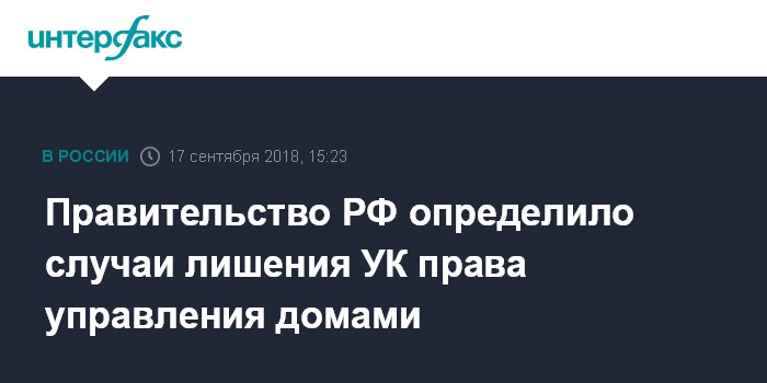 Москва. 17 сентября. INTERFAX.RU - Правительство РФ определило случаи лишения управляющих компаний (УК) права управления. Соответствующее постановление подписал премьер-министр Дмитрий Медведев.